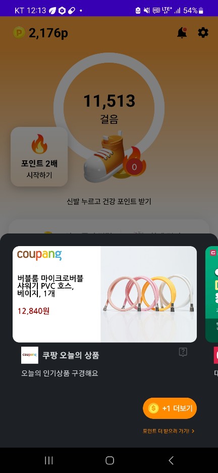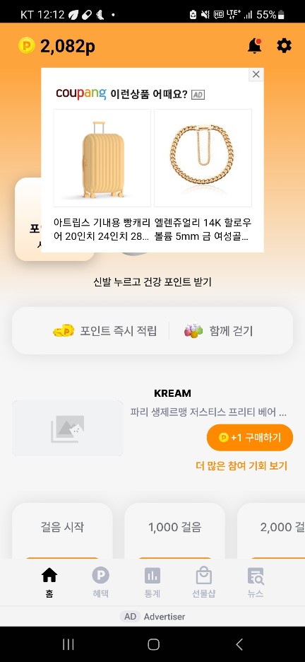 포인트는 만보를 걷는다는 기준으로 기본적으로 100포인트 / 주행거리가 하루 10km 가 넘는 경우 추가적으로 100포인트를 얻을 수 있습니다. 30포인트씩 획득을 위한 광고를 시청하더라도 200포인트 기준 7번 정도 광고 시청으로 큰 부담 없이 200포인트 획득이 가능한 점이 장점이라고 봅니다.