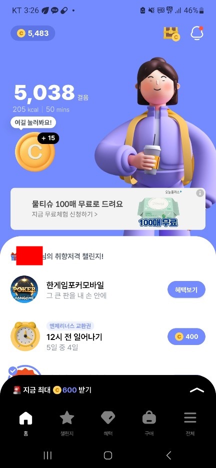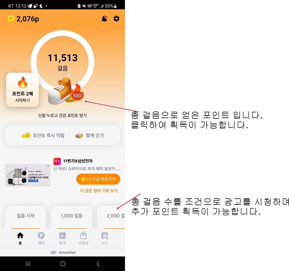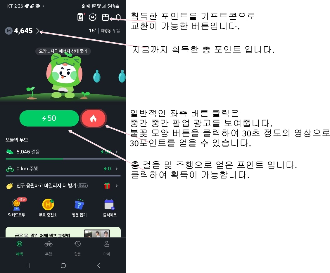 1. 걸음 (5,000보 - 100포인트), 화면 메인의 불꽃 버튼을 통해 획득이 가능한 포인트입니다.