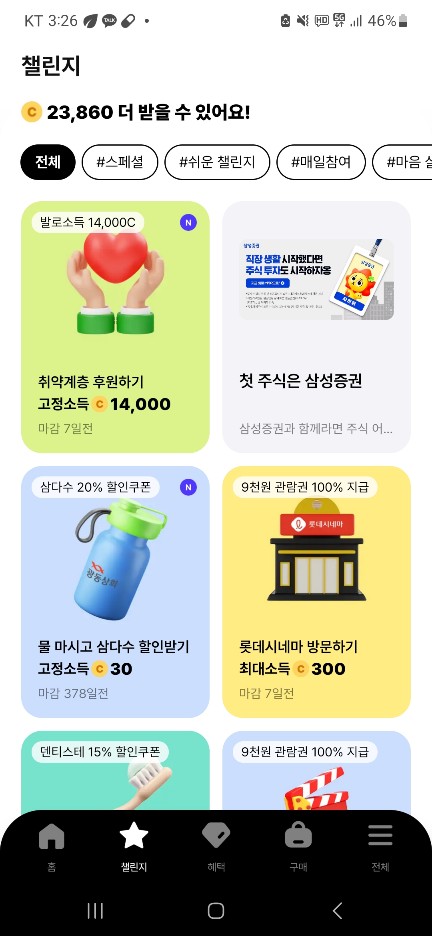 이러한 챌린지는 양치하기 날씨 검색, 책읽기 등 부담 스럽지 않은 것들로 구성이 되어 있습니다. 이러한 챌린지는 포인트 획득 이 외 경품과 같이 커피, 햄버거 등의 당첨 기회도 존재합니다.