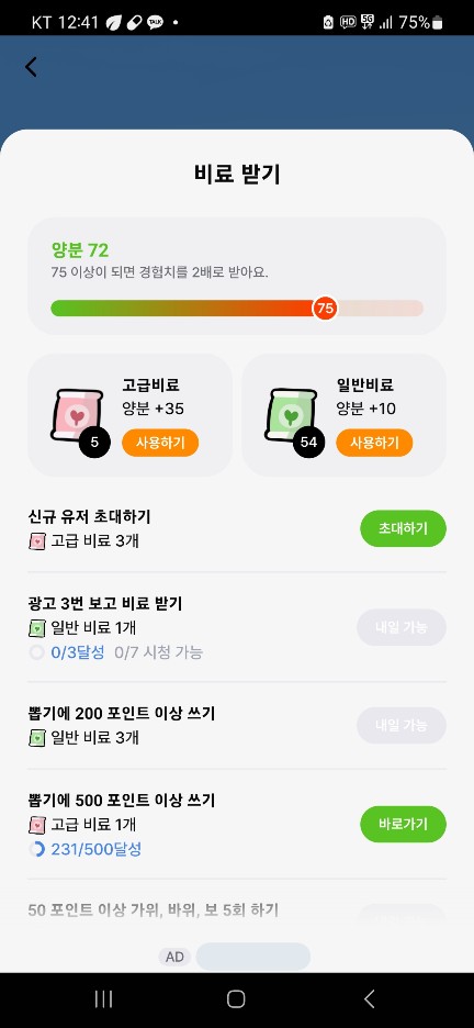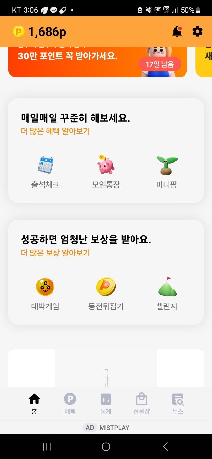 3. 출석 체크와 광고시청을 통해 적은 포인트 추가 획득이 가능합니다.