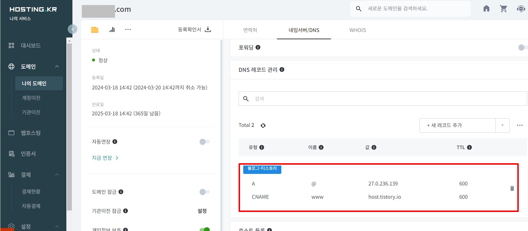 호스팅 kr 홈페이지 접속 → <화면 우측 중간의 도메인 관리> 선택 → 연결하고자 하는 도메인 선택 → 네임서버 /DNS 선택 → 화면 아래 <+새 레코드 추가 ▼ > 클릭 → 티스토리 블로그 선택