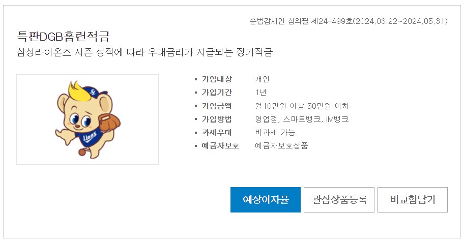 | DGB 홈런예금 | 삼성라이온즈 | 3.50 | +0.30 | 3.80 |