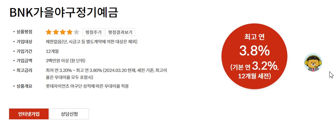 | BNK, 가을야구 정기예금 | 롯데자이언츠 | 3.20 | +0.60 | 3.80 |