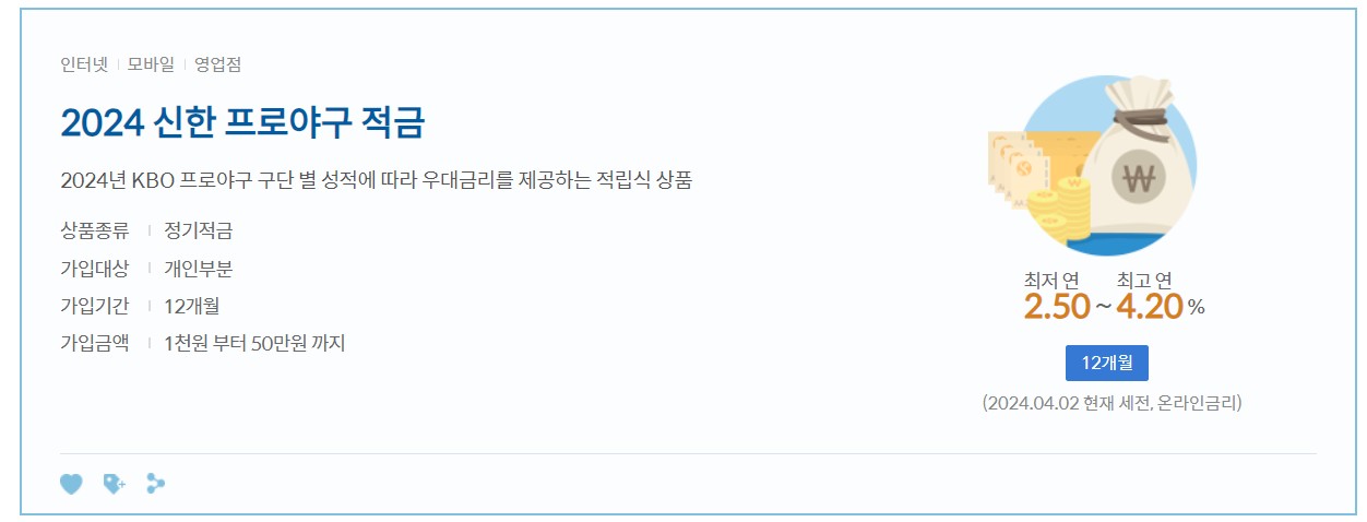 먼저 신한은행의 신한 프로야구 적금을 보겠습니다.