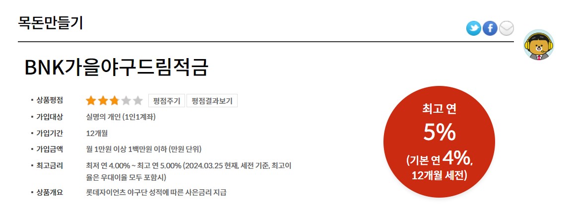 | BNK, 가을야구 정기적금 | 롯데자이언츠 | 4.00 | +1.00 | 5.00 |