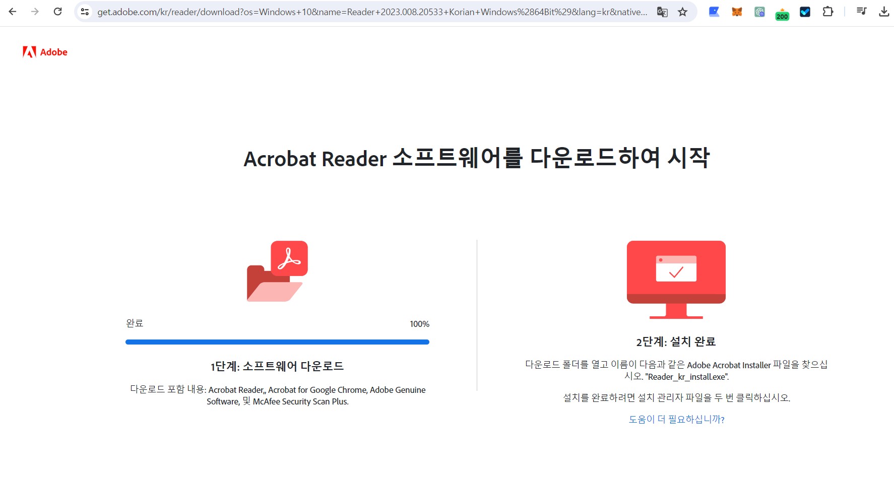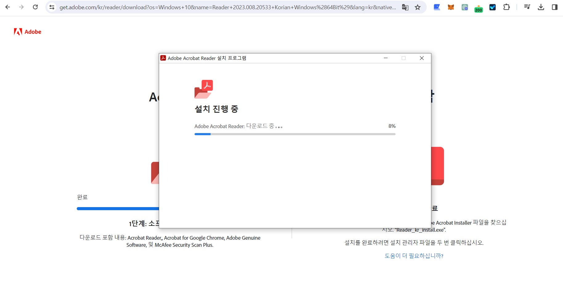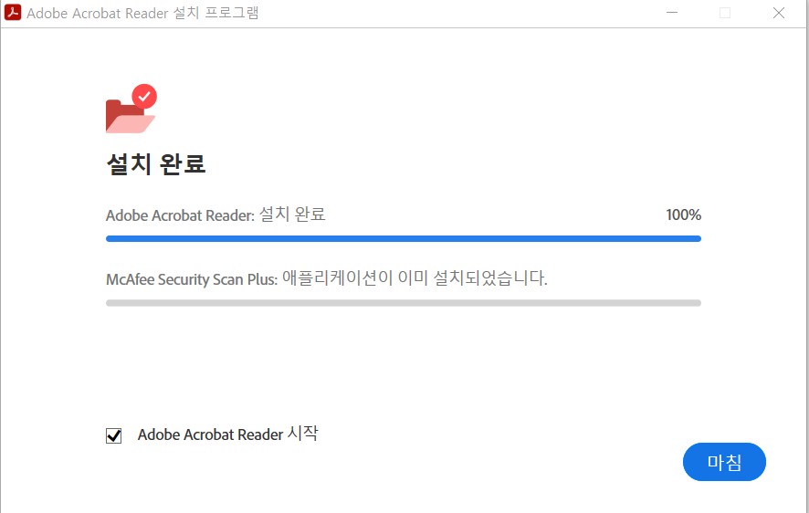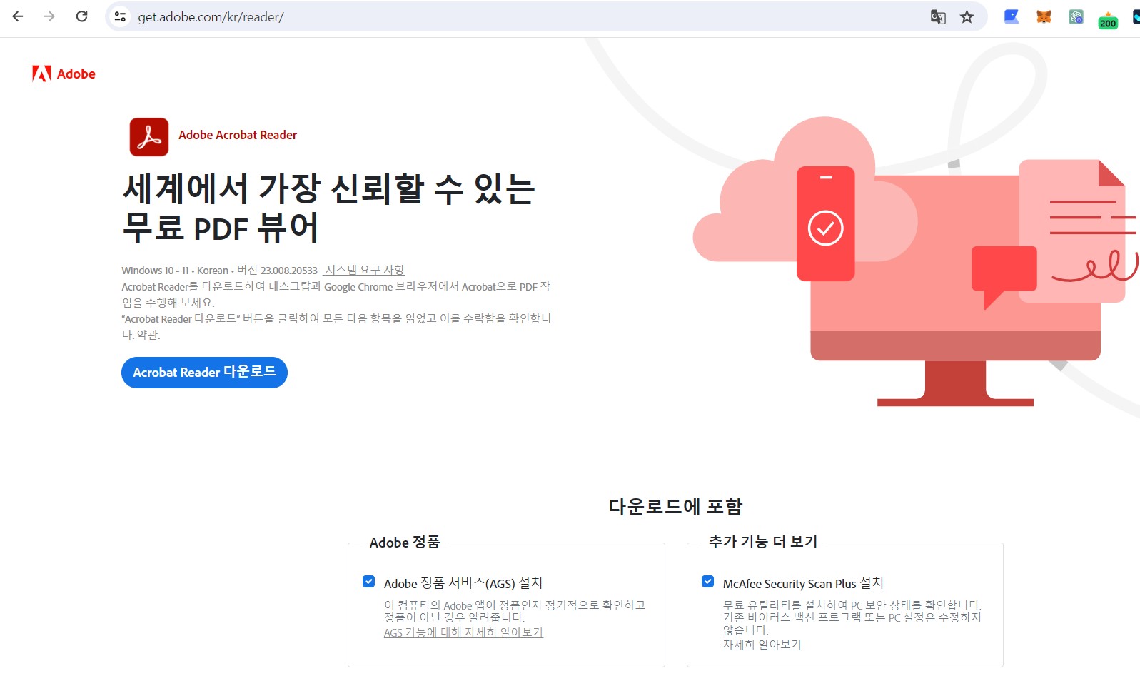 가볍게 뷰어만 설치하고자 하시는 분들은 화명 아래 보이는 abobe 저품 서비스(AGS)설치와 McAfee Security Sacn Plus 설치 선택을 해체 하시면 됩니다. 굳이 필요한 서비스라고 생각되지 않습니다.