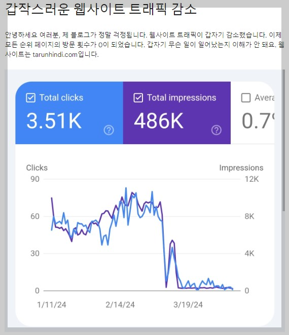 최근 구글 검색 유입 뿐 아닌 노출이 0으로 바뀌면서 해당 내용에 대해 기록을 남기고자 글을 작성합니다.