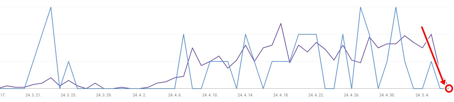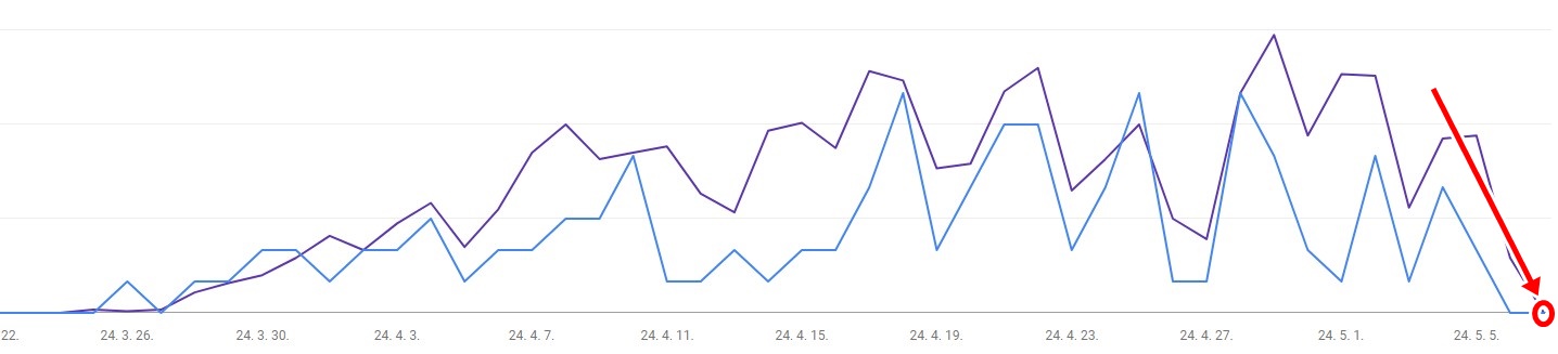 아래 첨부한 그래프는 제 서치콘솔 실적 내용으로 24.5.6~7 이후, 모든 도메인이 노출이 0으로 (당연하지만 클릭도 0) 으로 변경되었습니다.