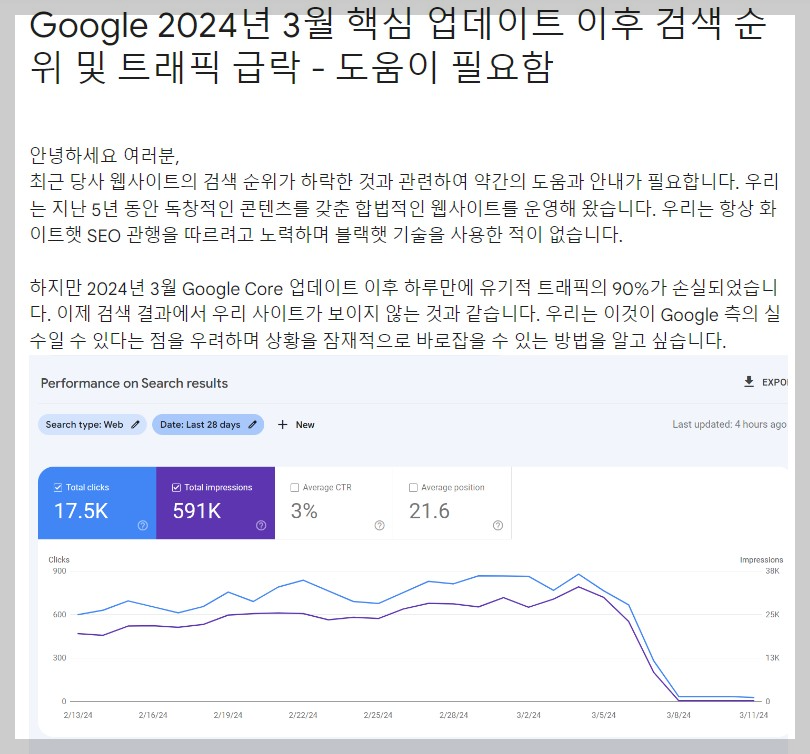 검색 내용을 요약하면, 예전부터 구글에서 검색 알고리즘 업데이트가 있을때 비슷한 증상이 나타나는 경우가 많았고