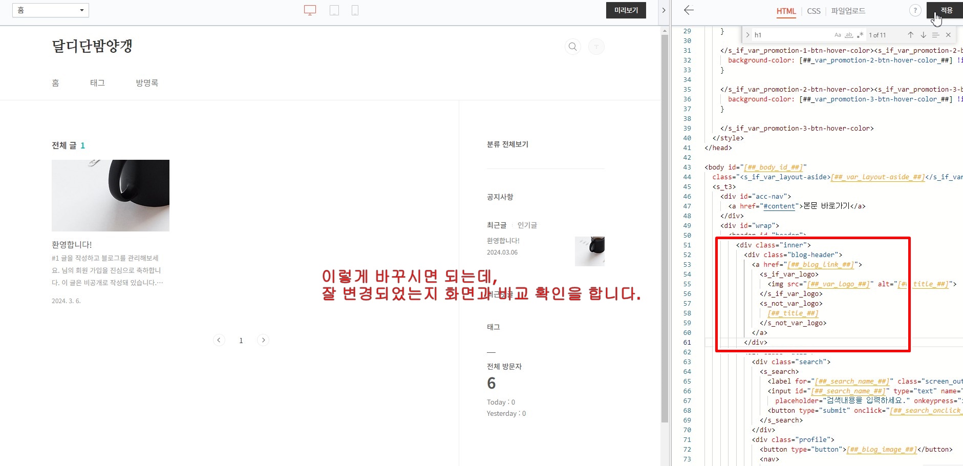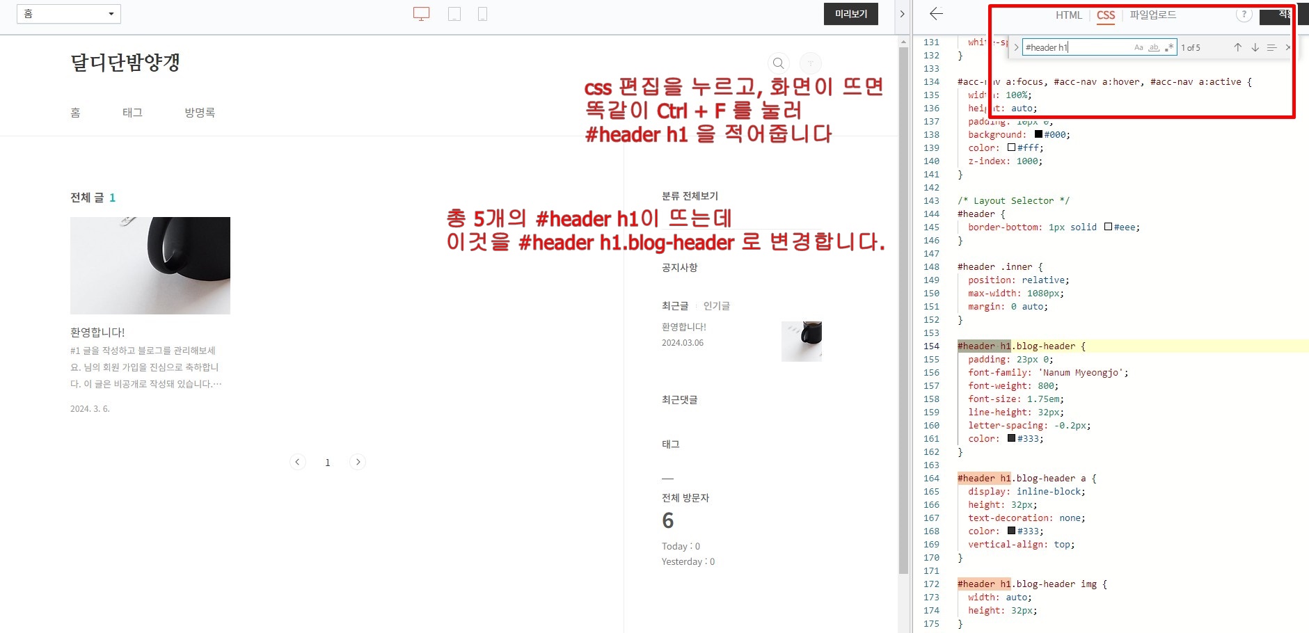 즉 5개의 #headre h1 코드를 모두 #headre h1.blog-header 로 변경해 주셔야 합니다. 그리고 우측 상단 저장을 눌러주시면 세팅이 완료 됩니다.
