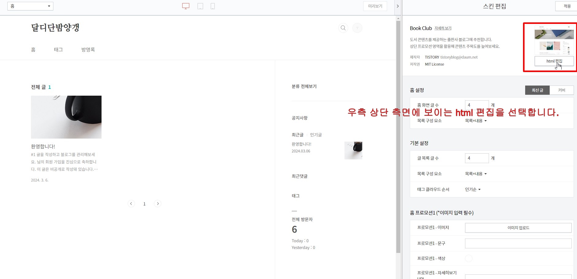 새로운 창의 좌측은 준비중인 블로그 화면이 보이고 우측은 여러가지 설정창으로 보입니다. 우측의 html 편집 버튼을 클릭합니다.