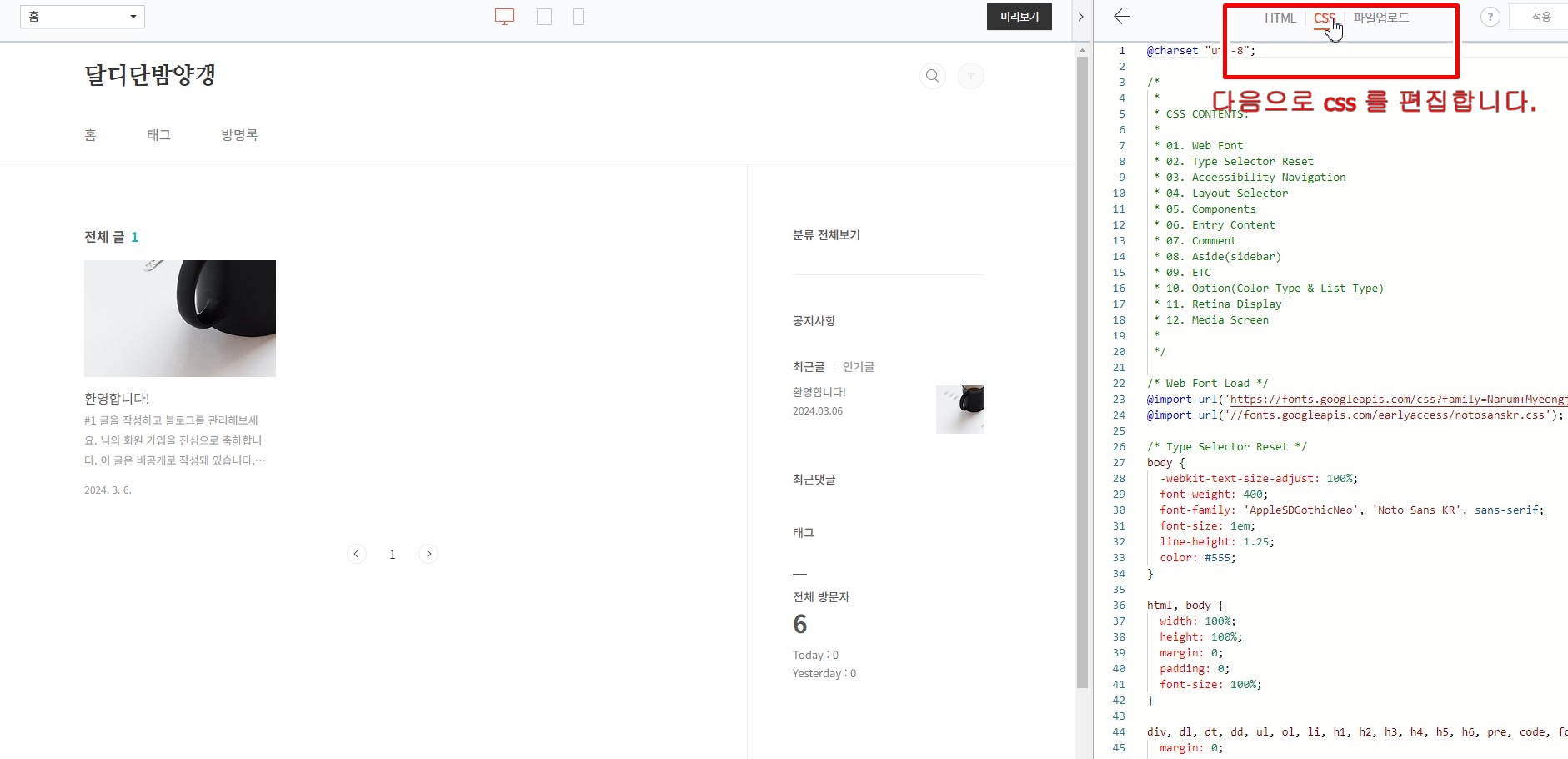 다음으로 css 편집을 진행하여야 합니다.