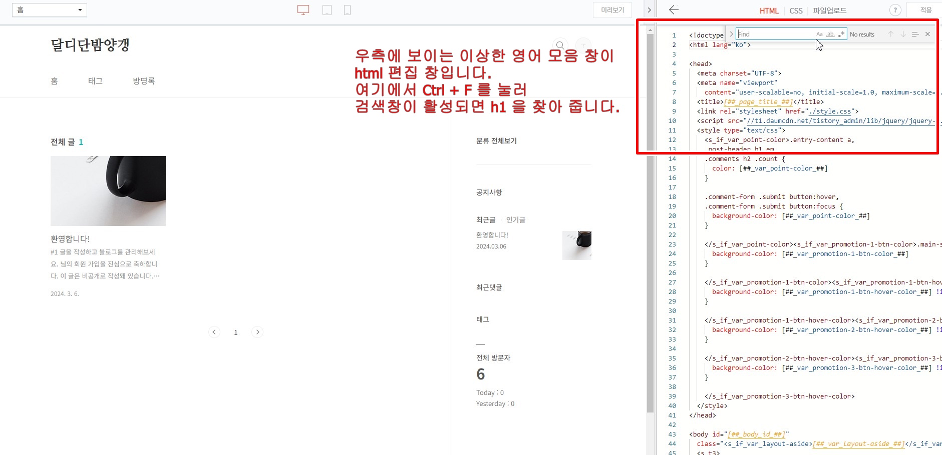 클릭후, 우측 창이 HTML, CSS, 파일업로드로 바뀌는 것을 볼 수 있습니다. 여기서 영어로 많이 작성된 내용이 HTML 코드로 보시면 됩니다. 창을 클릭한 후, Ctrl 버튼을 누른 후 F 키를 눌러 h1을 찾아 줍니다.