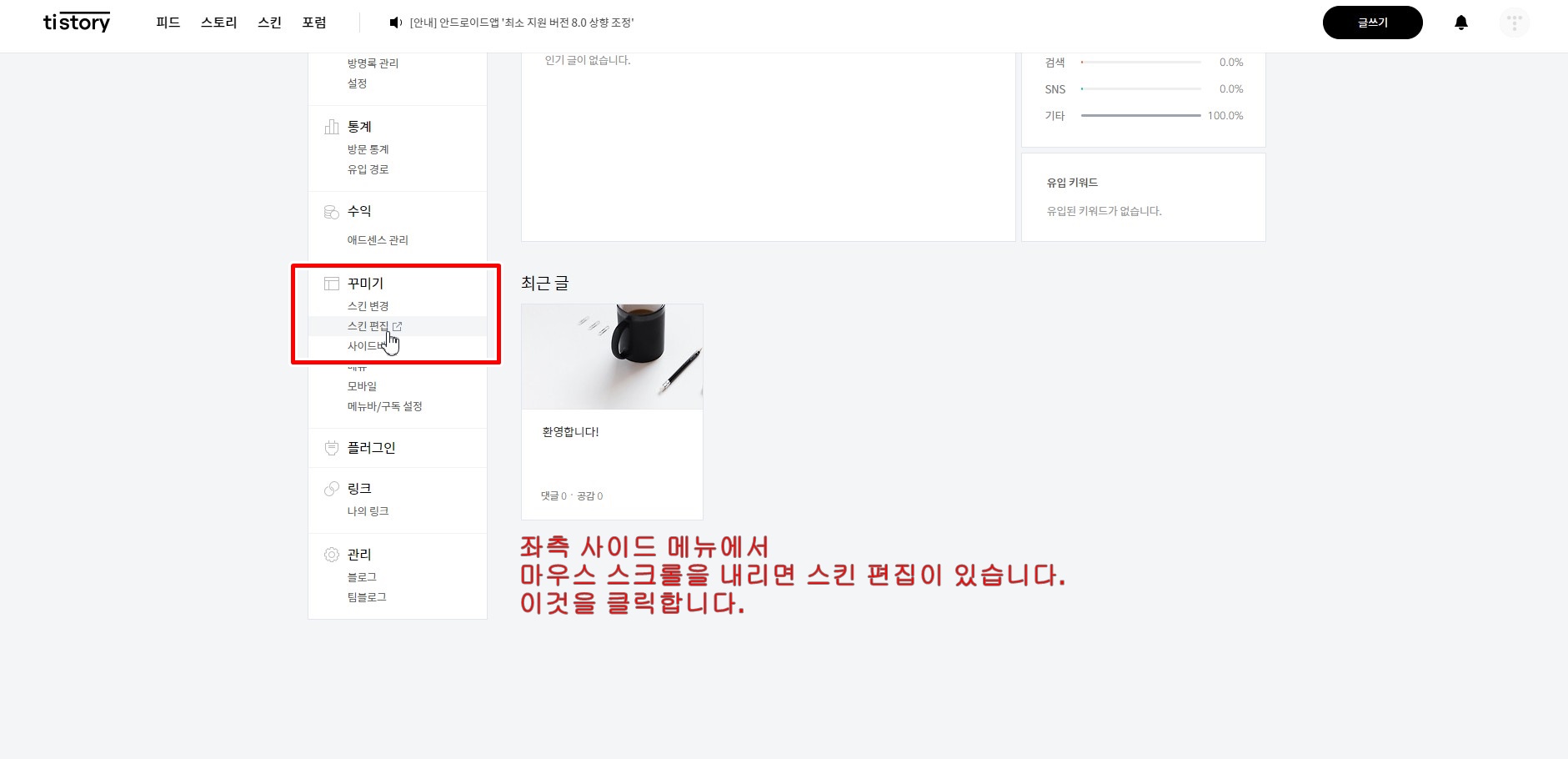 관리 설정창이 열리면, 좌측 사이드 메뉴를 아래로 내려보시면, 꾸미기에서 스킨 편집을 찾을 수 있습니다. 여기서 스킨 편집을 선택하면 새로운 창으로 전환이 됩니다.