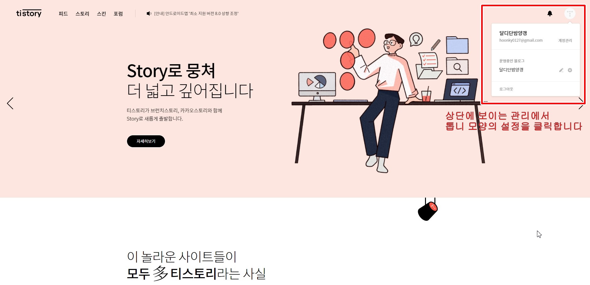 먼저 티스토리 홈페이지에 접속하여, 로그인을 한 후 본인의 블로그 관리 세팅으로 들어갑니다.