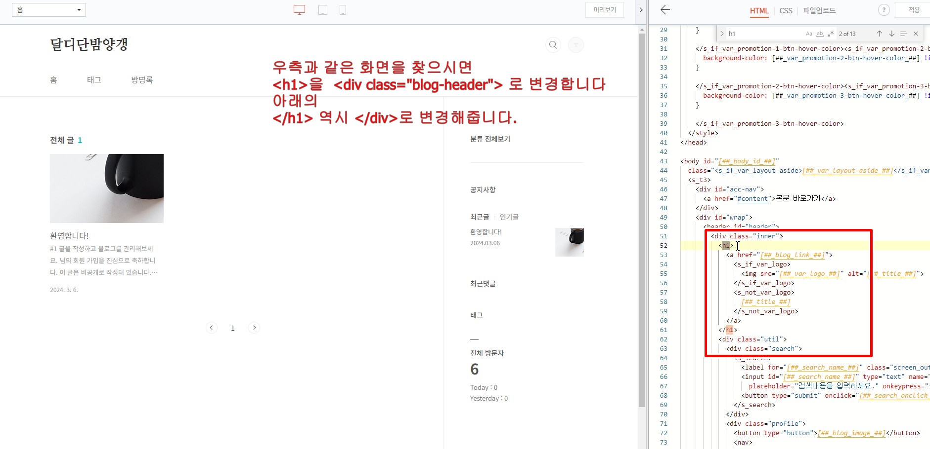 마찬가지로 기존 <h1> 코드 아래에 보이는 </h1> 코드는 </div> 로 설정을 변경해 줍니다.