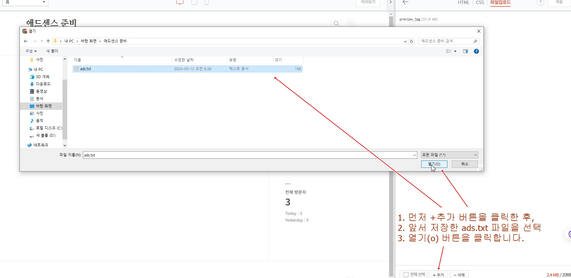 화면이 변환되면, 아래의 + 추가 버튼을 클릭한 후, 파일 검색 화면이 나타나기를 기다립니다. 파일 검색화면이 나타난다면, 앞서 저장한 ads.txt 파일이 있는 곳으로 이동합니다. 여기서 작성한 ads.txt 파일을 선택하여 열기 버튼을 눌러줍니다.