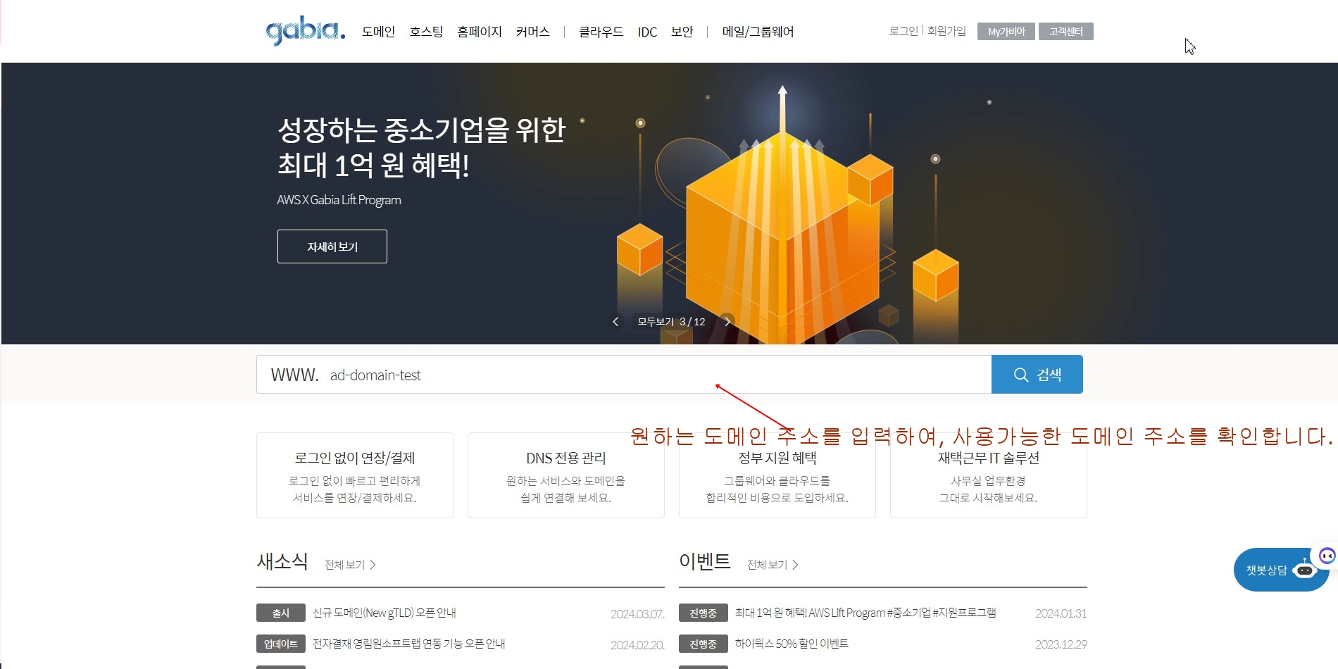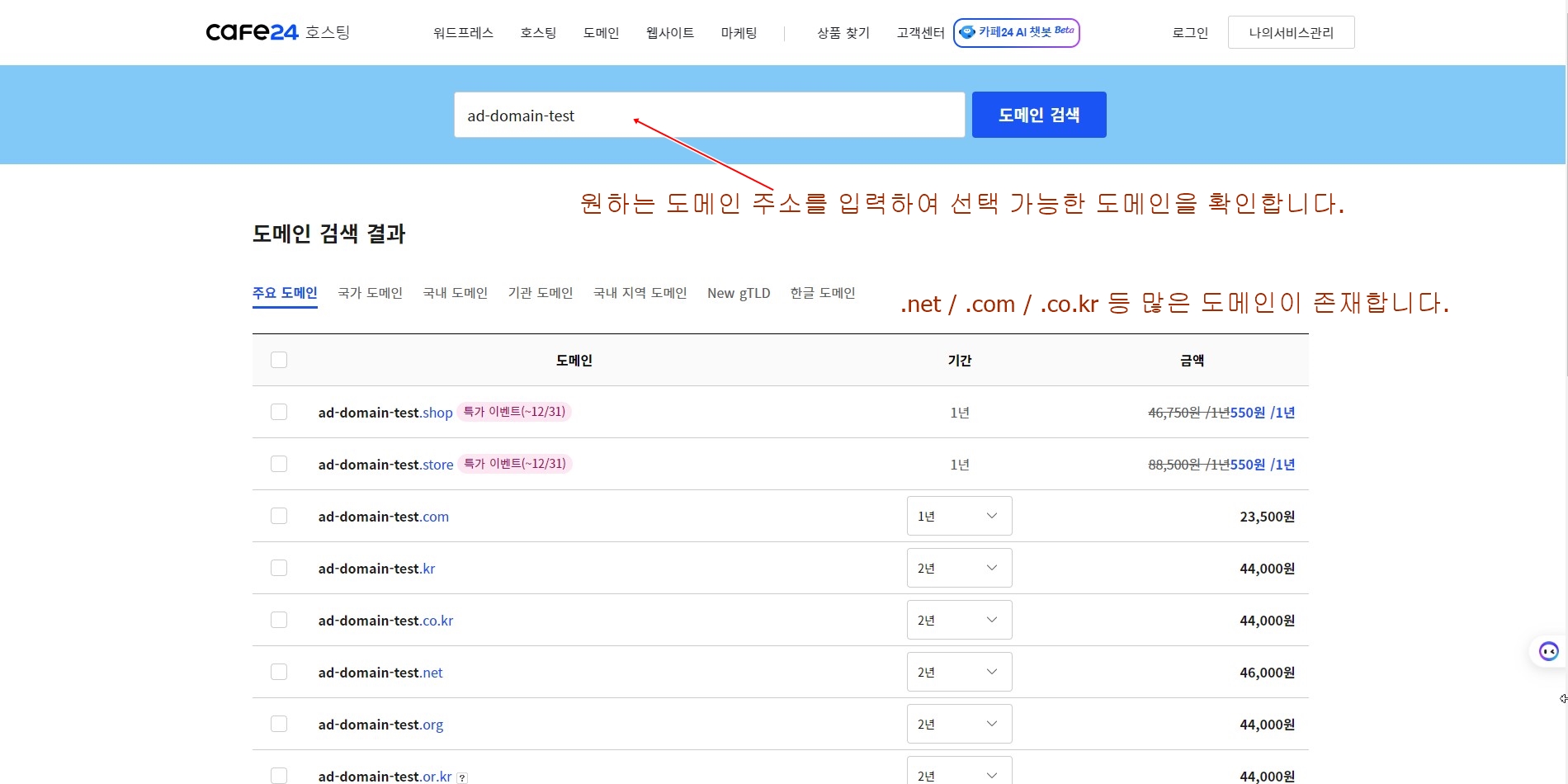 홈페이지에 접속하여 도메인 검색 창에 원하는 도메인을 입력하여 사용가능한 도메인 주소를 확인 가능합니다.