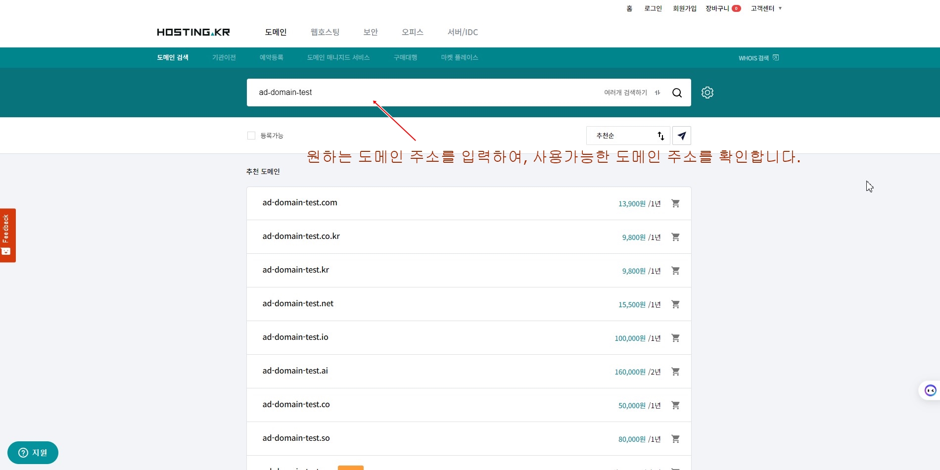 호스팅kr 검색화면 입니다.
